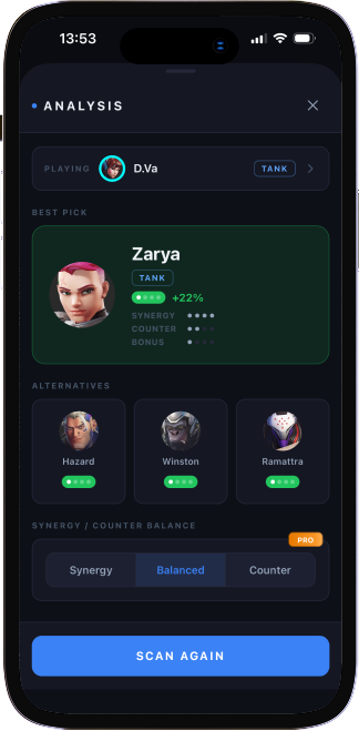 Point your phone at the Overwatch 2 scoreboard. OverHelper instantly identifies every hero and recommends your optimal pick — scored across synergies, counters, map, and rank.